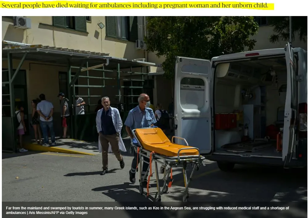 Ο θάνατος μιας εφήβου έγκυου και του αγέννητου παιδιού της είναι μόνο δύο από τους τουλάχιστον εννέα πιθανούς θανάτους που θα μπορούσαν να αποφευχθούν στην Ελλάδα αυτό το καλοκαίρι λόγω χρόνιων ελλείψεων σε ασθενοφόρα και προσωπικό υγειονομικής περίθαλψης, ακόμη και πριν η χώρα πολιορκηθεί από τις μαινόμενες δασικές πυρκαγιές.