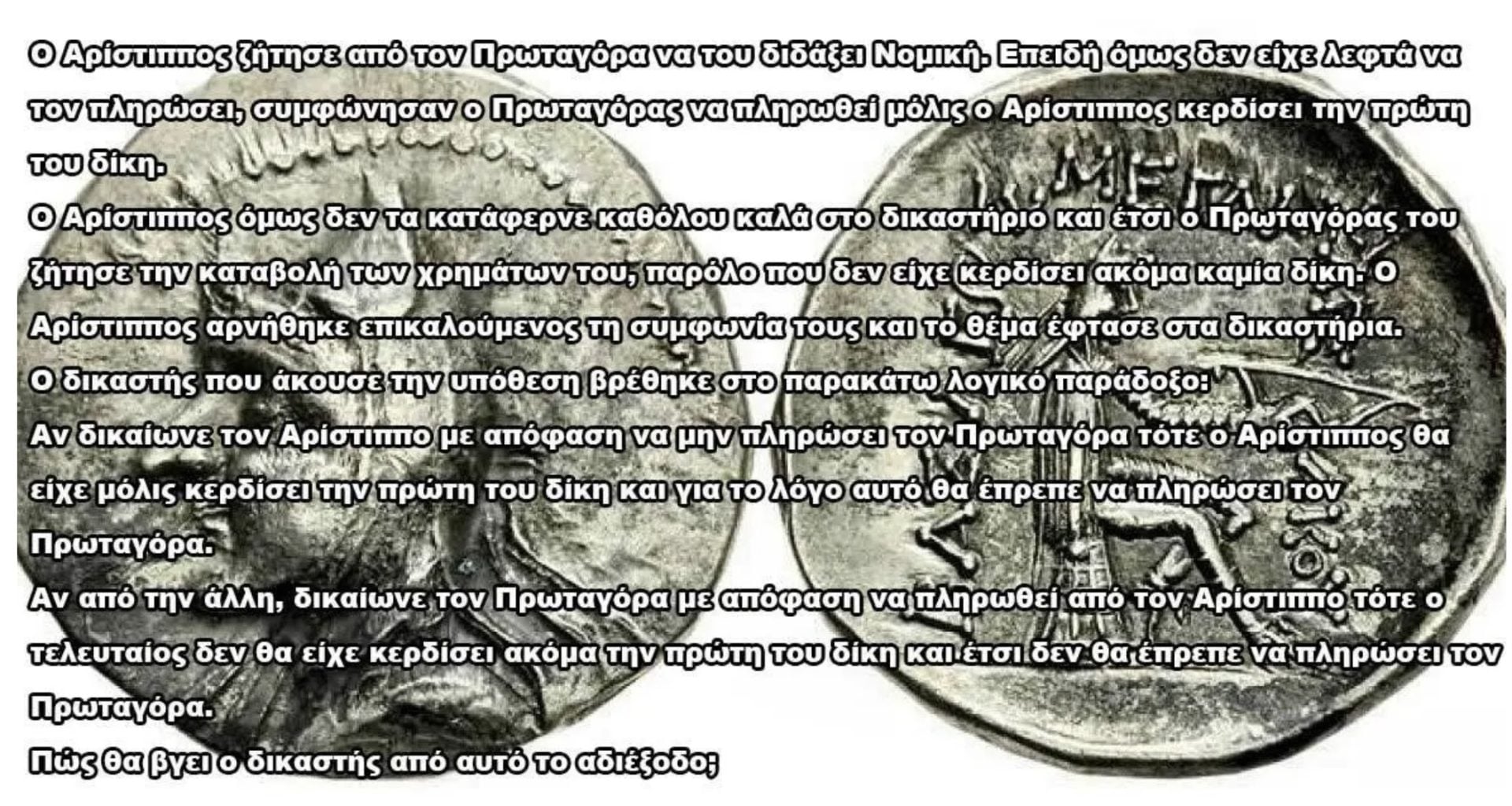 Αν δικαίωνε τον Αρίστιππο με απόφαση να μην πληρώσει τον Πρωταγόρα τότε ο Αρίστιππος θα είχε μόλις κερδίσει την πρώτη του δίκη και για το λόγο αυτό θα έπρεπε να πληρώσει τον Πρωταγόρα.