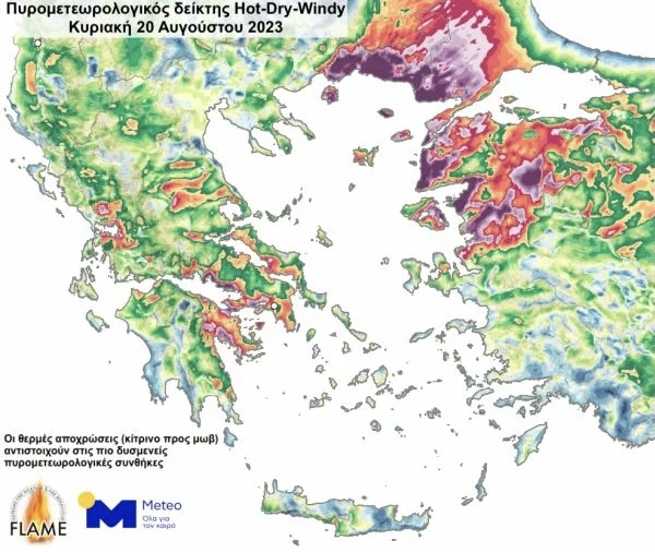 Ειδικότερα και με βάση τα πιο πρόσφατα διαθέσιμα προγνωστικά στοιχεία της Πυρομετεωρολογικής Ομάδας FLAME της μονάδας ΜΕΤΕΟ/ΕΑΑ, πολύ υψηλή έως και ακραία επικινδυνότητα με καιρό τύπου Hot-Dry-Windy αναμένεται την Κυριακή και τη Δευτέρα, 20 -21.08.2023 σε μεγάλο τμήμα της ηπειρωτικής Ελλάδας και των νησιών του Β. Αιγαίου.
