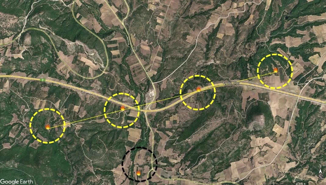Παρατήρηση (2): Αξίζει να σημειωθεί ότι παρόμοια περίπτωση «ξεσπάσματος ταυτόχρονων εστιών φωτιάς σε γραμμική διάταξη» είχε αναφερθεί την «26η/07/2018» από την ειδησεογραφική ιστοσελίδα «news247.gr» [4].