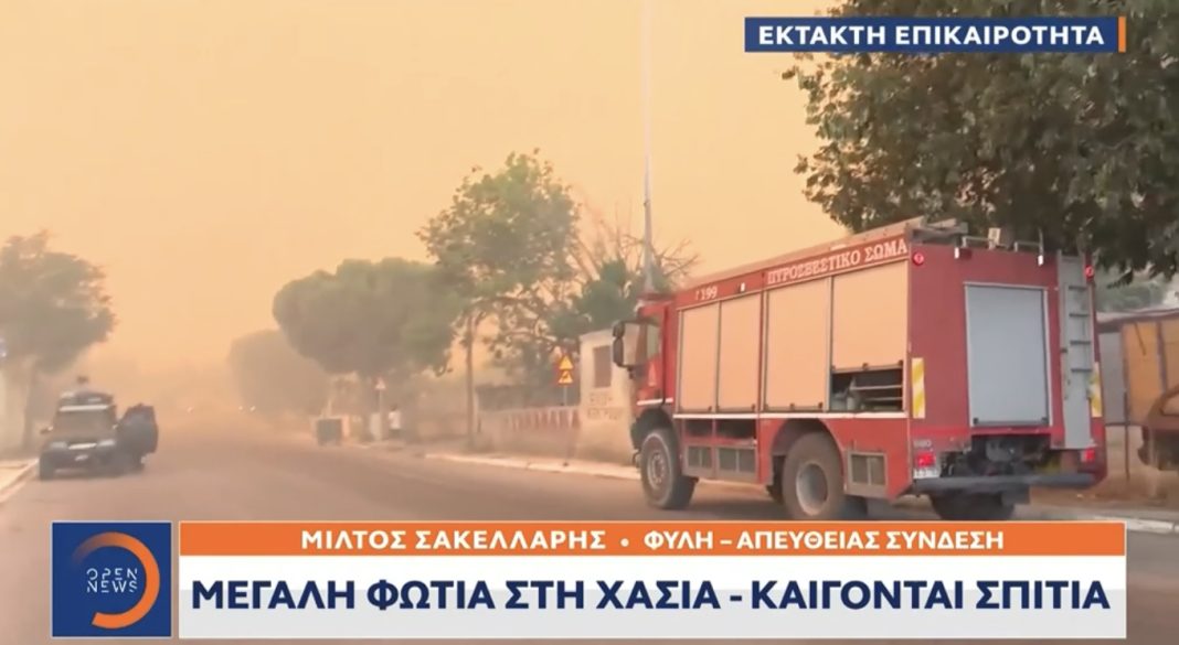 Στην περιοχή της Φυλής έχουν ήδη τυλιχθεί στις φλόγες σπίτια και καταστήματα, με την κατάσταση να είναι αποπνικτική, την ώρα που οι πυκνοί καπνοί φτάνουν μέχρι την Αττική Οδό. Δραματική, εξάλλου, ήταν και η έκκληση του δημάρχου Φυλής, Χρήστου Παππού, που ζητούσε επειγόντως εναέρια μέσα «Στείλτε εναέρια μέσα, γιατί δεν μαζεύεται αλλιώς η φωτιά! Στείλτε άμεσα εναέρια μέσα! Φαίνεται ότι η φωτιά άρχισε από έκρηξη κολώνας μέσα στο δάσος και με την τόση ένταση του αέρα επεκτάθηκε αμέσως σε ολόκληρη τη δυτική πλευρά της Χασιάς», είπε νωρίτερα, μιλώντας στο ΣΚΑΪ.