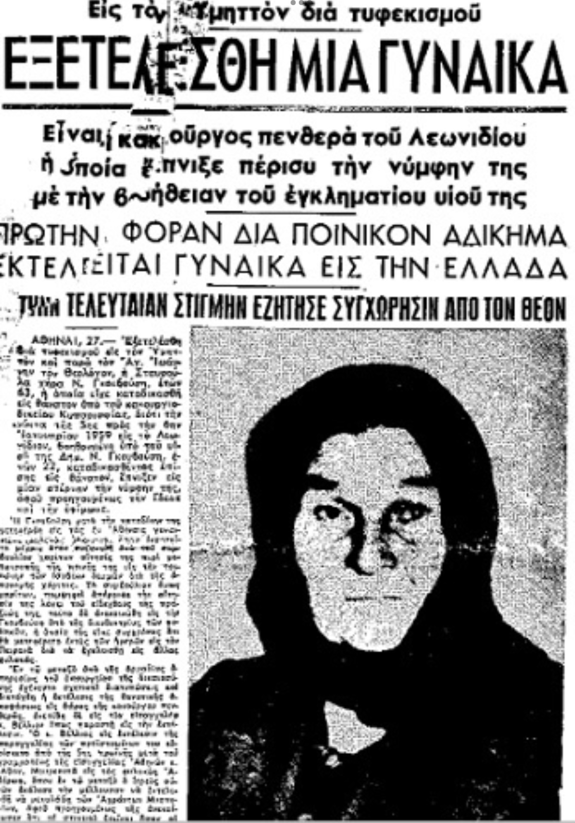Η εκτέλεση της 63χρονης πεθεράς ήταν η πρώτη εκτέλεση γυναίκας στην Ελλάδα, δεν ήταν όμως η πρώτη καταδίκη σε θανατική ποινή, καθώς το 1931 είχαν καταδικαστεί σε θάνατο η σύζυγος και η πεθερά του Δημήτρη Αθανασόπουλου, η ποινή των οποίων όμως μετατράπηκε στη συνέχεια σε ισόβια κάθειρξη.