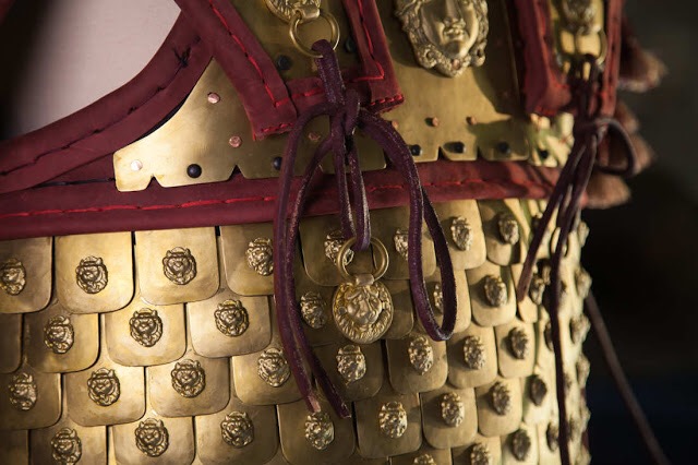 Για αυτό τον λόγω επιπρόσθετα οι δερμάτινες λωρίδες των κάτω πτερύγων έχουν επεξεργαστεί με σε φυσικό κερί για μακροχρόνια προστασία από υγρασία και την αποσαθρωτική επίδραση του ηλίου. Κάθε λωρίδα φέρει δερμάτινα πλευρικά τελειώματα και στην κάθετη απόληξη της κρόσια ως διακοσμητικά στοιχεία. Μεταλλικά διακοσμητικά μπρούτζινα επιθέματα με λεοντοκεφαλές βρίσκονται τοποθετημένα με πριτσίνια στην κάτω πλευρά των πτερύγων προσδίδοντας βάρος και σταθερότητα. Το ολικό βάρος της πανοπλίας ανέρχεται στα 17 κιλά. Γύρω από τον κυρίως κορμό μία δερμάτινη ζώνη με εντυπωσιακό μπρούτζινο πόρπακα περισφίγγει την πανοπλία ολοκληρώνοντας το σύνολο.