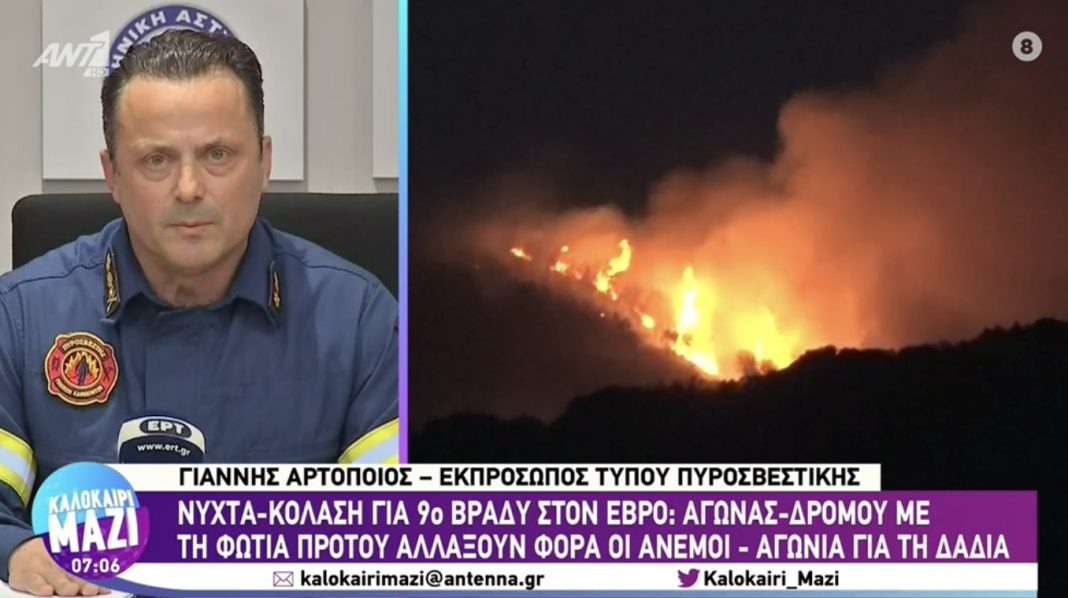 Παράλληλα, εκτός από το πολύ ισχυρό μέτωπο που έχει δημιουργηθεί στον Έβρο, τις προσπάθειες να προστατευθεί ο Εθνικός Δρυμός της Δαδιάς και η Λευκίμμη, ο εκπρόσωπος Τύπου του Πυροσβεστικού Σώματος, αναφέρθηκε και στις απανωτές εστίες πυρκαγιάς που προκλήθηκαν στην περιοχή και για τις οποίες διεξάγει έρευνα η ΕΥΠ. Ο Γιάννης Αρτοποιός τόνισε σχετικά ότι, στον Έβρο έχει δημιουργηθεί ένα πολύ ισχυρό μέτωπο. «Υπό πολύ αντίξοες συνθήκες καταφέραμε να ανταπεξέλθουμε σχεδόν σε όλες τις πυρκαγιές, με εξαίρεση φυσικά τον Έβρο, όπου έχει δημιουργηθεί ένα πολύ δύσκολο μέτωπο» δήλωσε ο κ. Αρτοποιός. Πρωτοσελιδα – Ειδήσεις