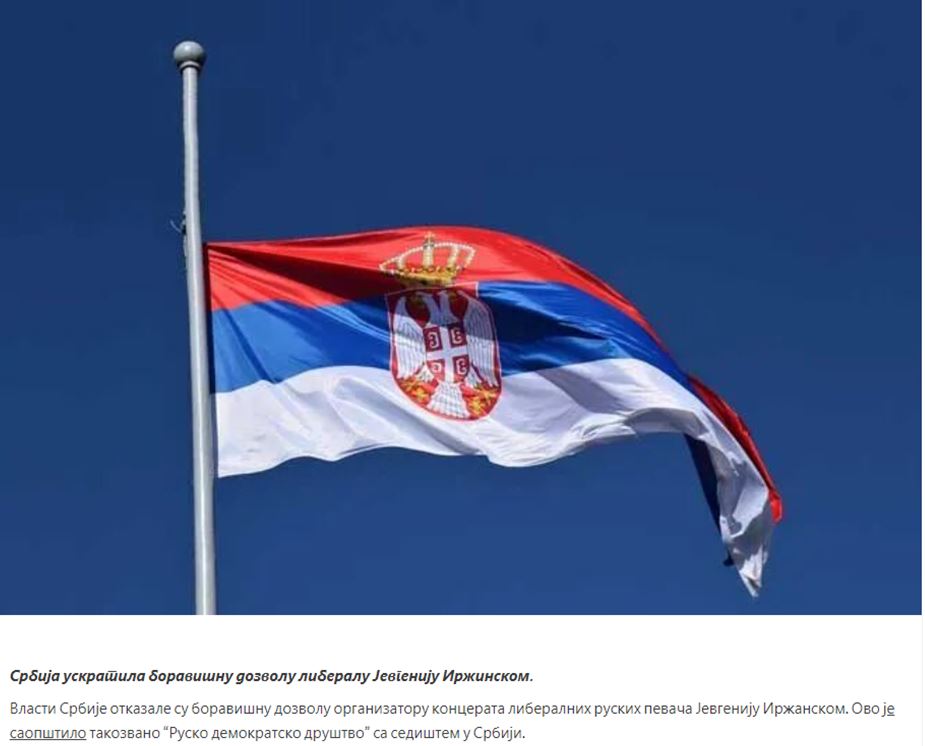 Οι σερβικές αρχές ανακάλεσαν την άδεια παραμονής του Γιεβγκένι Ιρζάνσκι, του Ρώσου πολίτη που διοργάνωσε αντιπολεμικές συναυλίες και άλλες πολιτιστικές εκδηλώσεις στη Σερβία, ανακοίνωσε η οργάνωση Ρωσικής Δημοκρατικής Κοινωνίας.