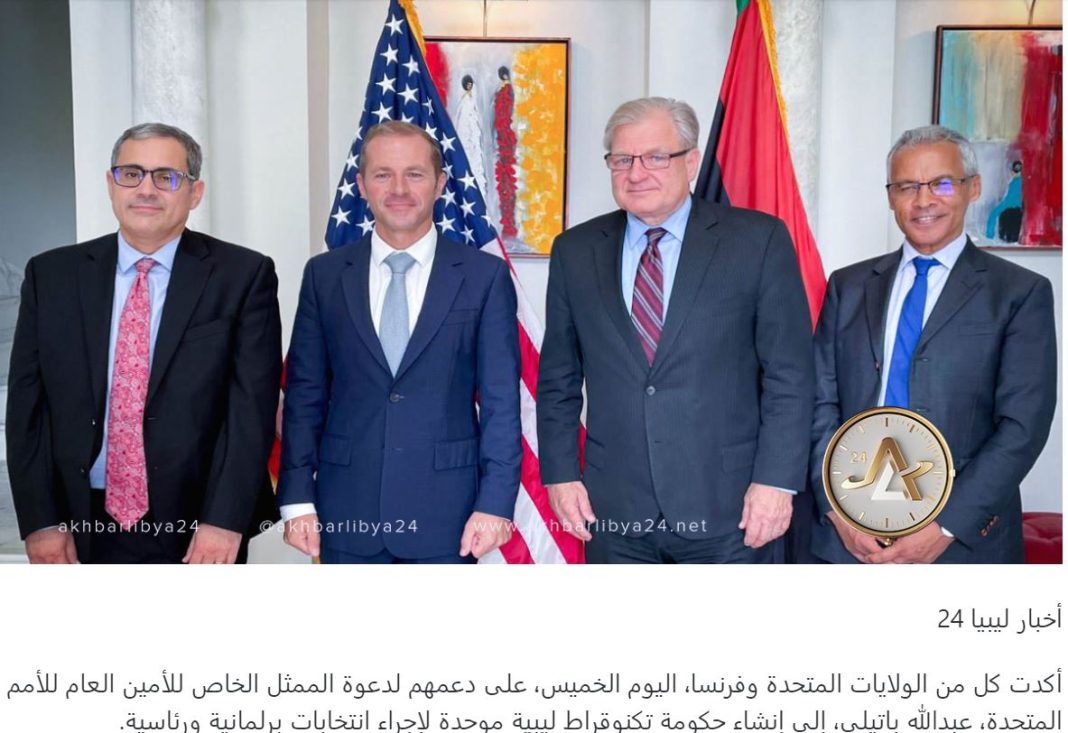 Σήμερα, Πέμπτη, οι Ηνωμένες Πολιτείες και η Γαλλία επιβεβαίωσαν την υποστήριξή τους στο κάλεσμα του Ειδικού Αντιπροσώπου του Γενικού Γραμματέα των Ηνωμένων Εθνών, Αμπντουλάχ Μπατίλι, για τη δημιουργία μιας ενοποιημένης λιβυκής κυβέρνησης τεχνοκρατών για τη διεξαγωγή κοινοβουλευτικών και προεδρικών εκλογών.