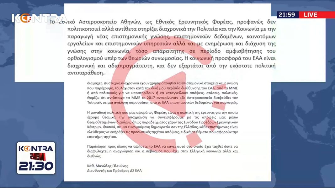Ο βουλευτής της Νέας Δημοκρατίας Στέλιος Πέτσας μιλώντας στο Kontra24 με την Αναστασία Γιάμαλη την Πέμπτη (31/8) δήλωσε ότι το Εθνικό Αστεροσκοπείο Αθηνών είναι πολιτικοποιημένο.