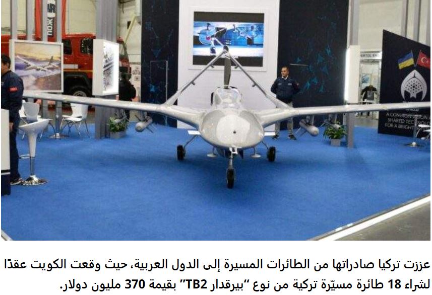 Η Τουρκία έχει ενισχύσει τις εξαγωγές drones της σε αραβικές χώρες. Στο πλαίσιο αυτό το Κουβέιτ υπέγραψε σύμβαση για την αγορά 18 τουρκικών μη επανδρωμένων αεροσκαφών «Bayraktar TB2», αξίας 370 εκατομμυρίων δολαρίων, αναφέρει κουβεϊτική εφημερίδα Al-Qabas, στην έκδοση της Πέμπτης 31 Αυγούστου 2023.