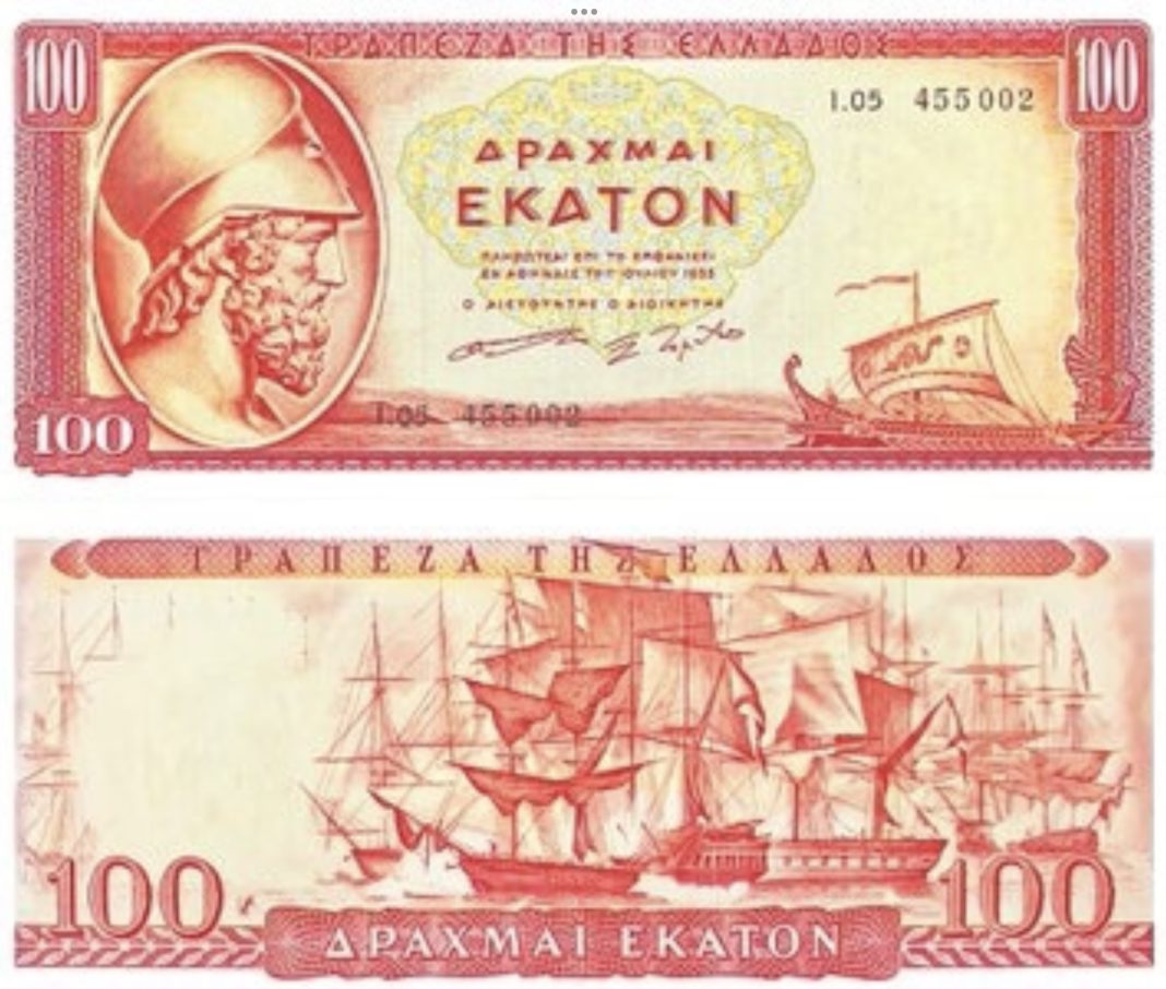 Το κατοστάρικο του 1954-55 είναι ένα ιδιαίτερο χαρτονόμισμα, αφιερωμένο σε δυο μεγάλες ναυμαχίες, της Σαλαμίνας και του Ναυαρίνου. Κατά μία άποψη οι δυό ναυμαχίες, που τις χωρίζουν 2.300 χρόνια, είναι οι πιο καθοριστικές ναυμαχίες στην ελληνική ιστορία: Η πρώτη (480π.Χ.) σήμανε την ήττα των Περσών και την αποτροπή της διείσδυσης του ανατολίτικου δεσποτισμού στον ευρωπαϊκό χώρο, ενώ ήταν η αφετηρία μιας πορείας που οδήγησε την Αθήνα στο Χρυσό Αιώνα. Η δεύτερη (1827) σήμανε τη γέννηση του νεότερου ελληνικού κράτους και επισφράγισε με δραματικό τρόπο την βούληση των λαών την Ευρώπης για την απελευθέρωση των επαναστατημένων Ελλήνων.