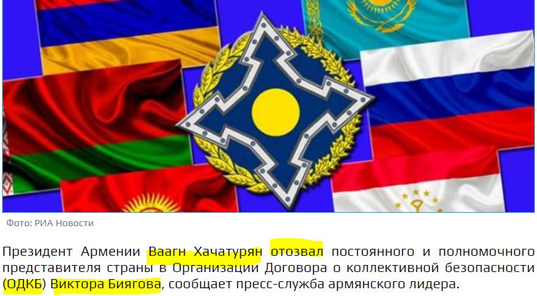 Ο πρόεδρος της Αρμενίας Βαχάγκν Χατσατουριάν ανακάλεσε τον μόνιμο και πληρεξούσιο εκπρόσωπο της χώρας στον Οργανισμό Συνθήκης Συλλογικής Ασφάλειας (CSTO) Βίκτορ Μπιγιάγκοφ, αναφέρει η υπηρεσία Τύπου του Αρμένιου ηγέτη, σύμφωνα με ρωσικά δημοσιεύματα.
