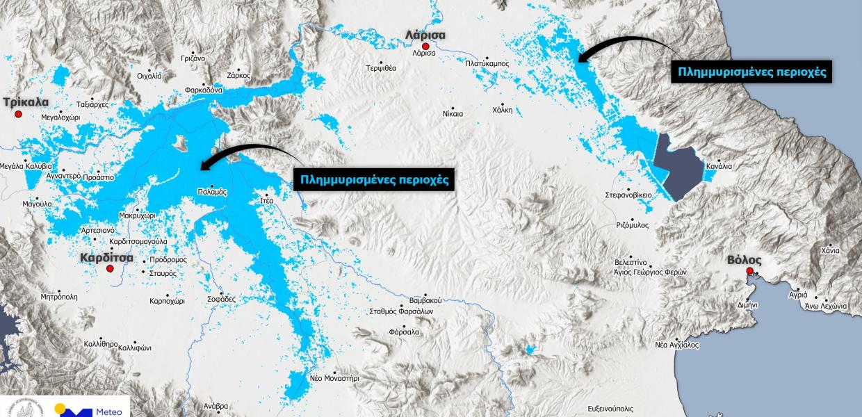 Σύμφωνα με το meteo του Εθνικού Αστεροσκοπείου Αθηνών, που δημοσιεύει τη σχετική απεικόνιση, το μεγαλύτερο μέρος των Νομών Τρικάλων και Καρδίτσας έχει κατακλυστεί από τα νερά χειμάρρων και παραποτάμων του Πηνειού. Στην Ανατολική Θεσσαλία, η έκταση της Λίμνης Κάρλα είναι σχεδόν ίση με την έκταση που είχε πριν την αποξήρανσή της το 1962. Συνολικά υπολογίζονται περίπου 720.000 στρέμματα πλημμυρισμένων εκτάσεων. Ο χάρτης με τα δορυφορικά δεδομένα που επεξεργάστηκε το Εθνικό Αστεροσκοπείο Αθηνών/meteo.gr δείχνει με γαλάζιο χρώμα τις περιοχές της Θεσσαλίας που έχουν πλημμυρίσει.