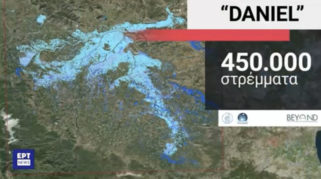 Στη δορυφορική εικόνα, που ανέλυσε το κέντρο BEYOND του Αστεροσκοπείου Αθηνών, αποτυπώνεται η έκταση που πλημμύρισε από την κακοκαιρία Daniel και είναι τριπλάσια σε σύγκριση με την έκταση που είχε κατακλυστεί από τον Ιανό.