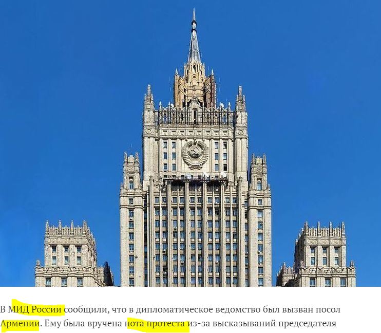 Τα ρωσικά media αναφέρουν ότι ο Αρμένιος πρέσβης στη Μόσχα κλήθηκε στο ρωσικό υπουργείο Εξωτερικών όπου του δόθηκε σημείωμα διαμαρτυρίας λόγω των δηλώσεων του Προέδρου της Εθνοσυνέλευσης της Αρμενίας Άλεν Σιμονιάν σχετικά με την επίσημη εκπρόσωπο του ρωσικού υπουργείου Εξωτερικών Μαρία Ζαχάροβα.