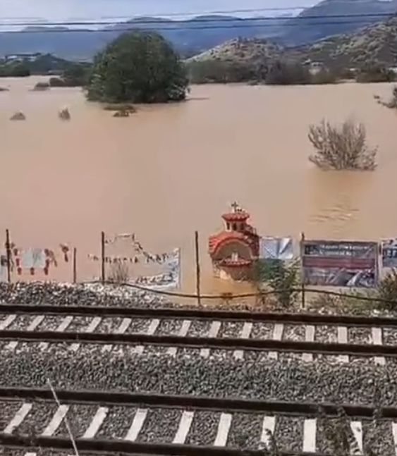 Κι αυτό, γιατί στο εν λόγω βίντεο βλέπουμε πως η τοποθεσία όπου πριν από έξι μήνες συνέβη το πολύνεκρο σιδηροδρομικό δυστύχημα που στοίχισε τη ζωή σε τουλάχιστον 57 ανθρώπους, στην συντριπτική πλειοψηφία τους νέους, έχει καλυφθεί από νερό εξαιτίας της υπερχείλισης του ποταμού Πηνειού, την οποία προκάλεσε το καταστροφικό πέρασμα της κακοκαιρίας Daniel από τη Θεσσαλία.