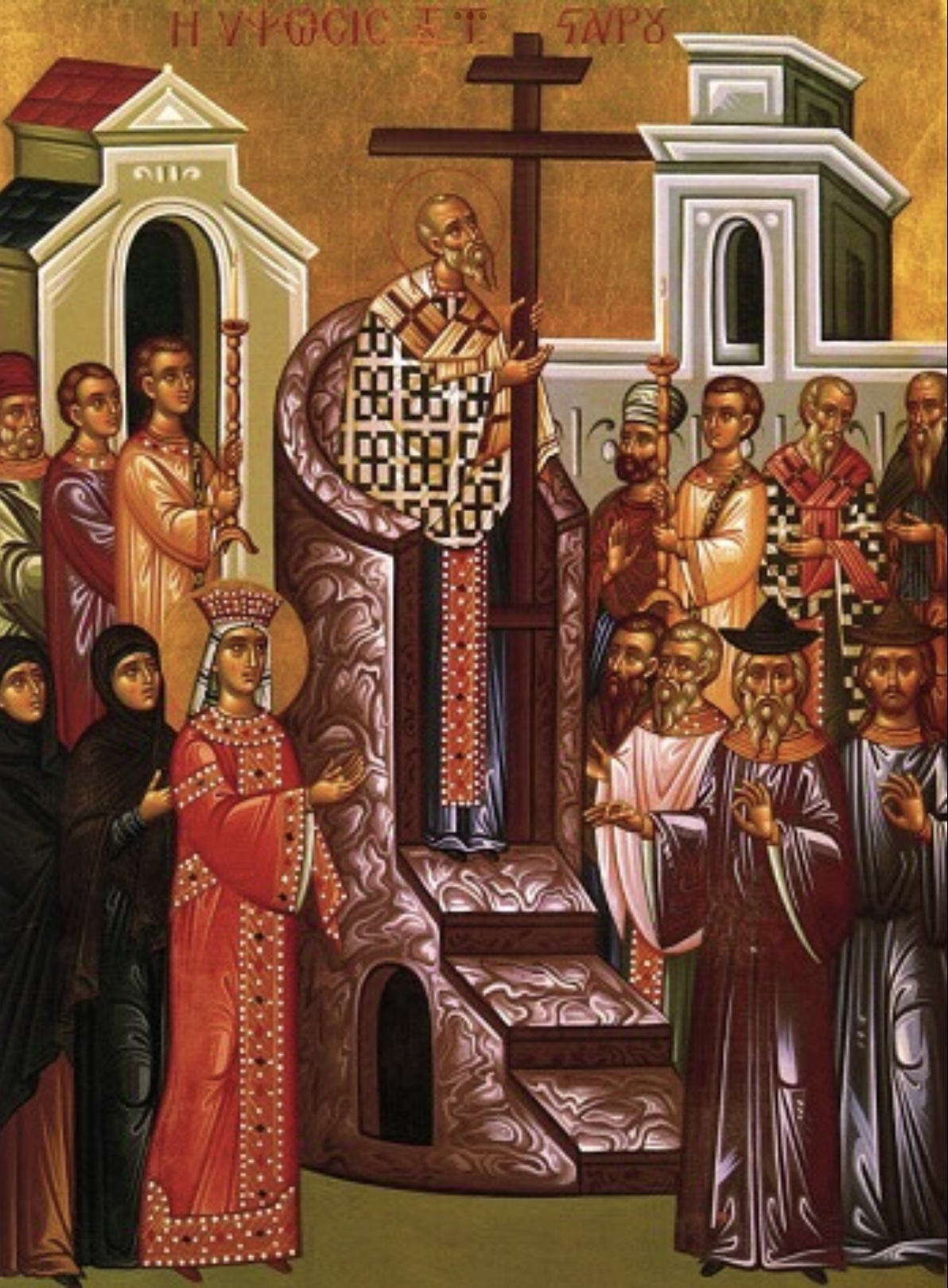 Γιὰ τὸ λόγο αὐτὸν στὴ συνέχεια ὁ Πατριάρχης Ἱεροσολύμων Μακάριος Τὸν ὕψωσε στὸν ἄμβωνα τοῦ Ναοῦ καὶ βλέποντάς Τον οἱ Χριστιανοὶ προσευχόμενοι ἔλεγαν καὶ ξανάλεγαν τὸ «Κύριε ἐλέησον». Κάτι ποὺ λέμε κι ἐμεῖς τὴν ἡμέρα τῆς Ὑψώσεως… Γιὰ τὸ λόγο αὐτὸν ὡς σήμερα σχηματίζουμε τὸ Σταυρὸ στὸ σῶμα μας καὶ μὲ αὐτὸν τελεσιουργοῦμε τὰ Μυστήρια καὶ λαμπρύνουμε τοὺς Ναούς μας.
