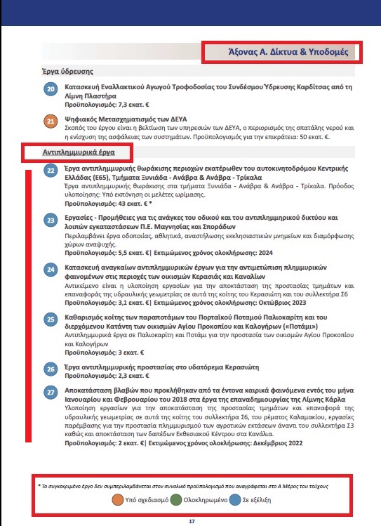 Συγκεντρωτικά το κόστος των έργων μέχρι το 2022 (συμπεριλαμβανομένου του ΙΑΝΟΥ) και αυτών που εξαγγέλθηκαν 24 Φεβ. 2023, στο πλαίσιο “Νέα έργα για τη Θεσσαλία του 2030″, ανέρχεται σε 661,9 εκατ. €