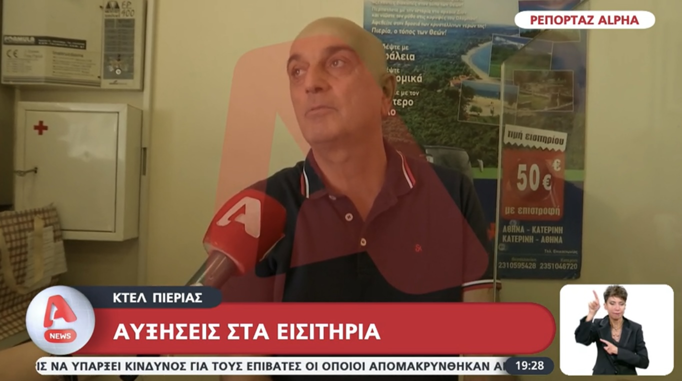 «Η τιμή ήταν 34 ευρώ, το κάναμε 44», είπε στον Alpha ο υπεύθυνος ΚΤΕΛ Πιερίας, Π. Ερμίδης, προσθέτοντας πως «ο κόσμος δεν έχει πρόβλημα με το εισιτήριο. Ο δρόμος Λάρισας – Κατερίνης είναι κλειστός και αναγκαστικά όλοι πηγαίνουμε από Πάτρα. Το δρομολόγιο είναι Πάτρα, Ιονία οδό, Εγνατία οδό και μετά Κατερίνη. Είναι 300 χλμ περίπου παραπάνω και τρεις ώρες»!