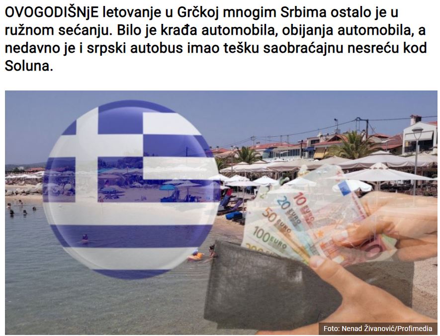 «Οι φετινές διακοπές στην Ελλάδα παρέμειναν κακή ανάμνηση για πολλούς Σέρβους. Υπήρξαν κλοπές αυτοκινήτων, διαρρήξεις αυτοκινήτων, ενώ πρόσφατα ένα σερβικό λεωφορείο είχε σοβαρό τροχαίο κοντά στη Θεσσαλονίκη», γράφει σερβικό