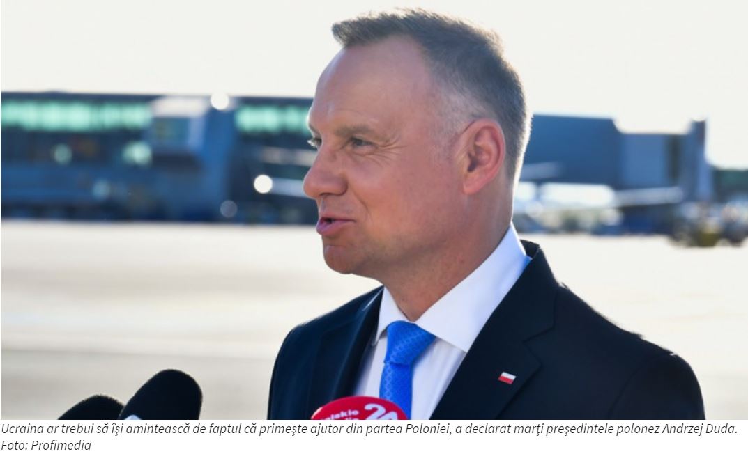 «Θα ήταν καλό για την Ουκρανία να θυμάται ότι λαμβάνει βοήθεια από εμάς και να θυμάται ότι είμαστε επίσης χώρα διέλευσης προς την Ουκρανία», είπε ο πρόεδρος Αντρέι Ντούντα σε δημοσιογράφους στη Νέα Υόρκη, μετά από ομιλία του ενώπιον της Γενικής Συνέλευσης των Ηνωμένων Εθνών, σύμφωνα με το Reuters, το οποίο επικαλείται το ρουμανικό «News».