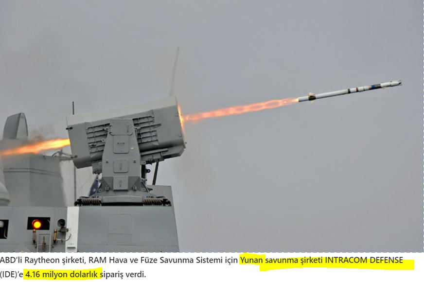 Η αμερικανική εταιρεία Raytheon έκανε παραγγελία αξίας 4,16 εκατομμυρίων δολαρίων στην ελληνική αμυντική εταιρεία INTRACOM DEFENSE (IDE) για το Σύστημα Αεροπορικής και Πυραυλικής Άμυνας RAM, γράφει τούρκικο δημοσίευμα.