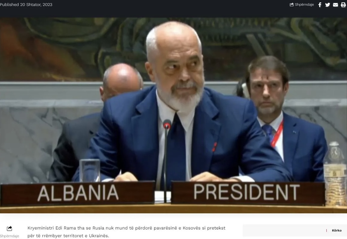 Ο πρωθυπουργός Έντι Ράμα, ασκώντας καθήκοντα προέδρου στο Συμβούλιο Ασφαλείας του ΟΗΕ, είπε ότι η Ρωσία δεν μπορεί να χρησιμοποιήσει την ανεξαρτησία του Κοσσυφοπεδίου ως πρόσχημα για να καταλάβει ουκρανικά εδάφη.