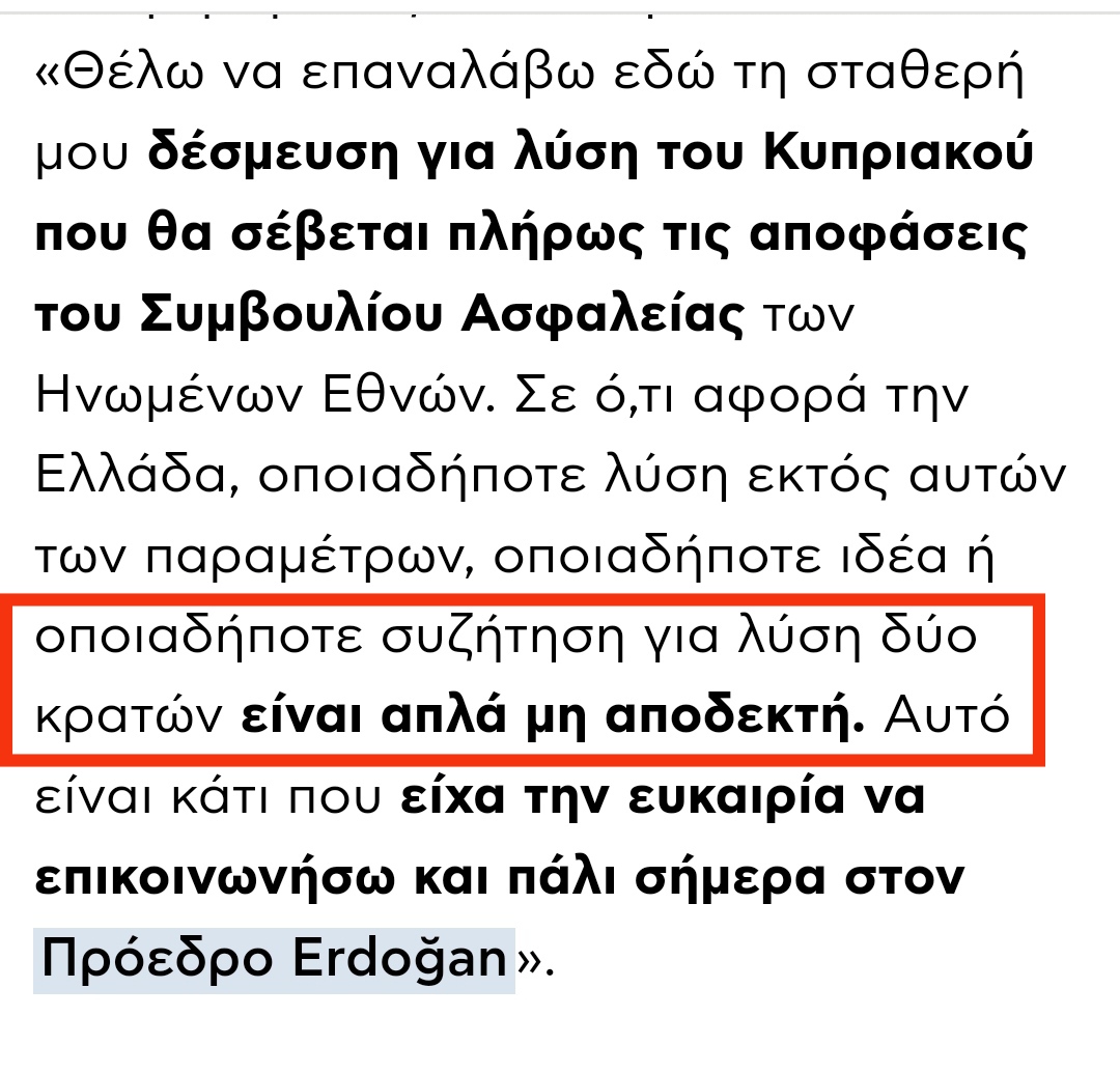 Η τουρκοκυπριακή οντότητα που έχει αυτοανακηρυχθεί στα κατεχόμενα και η οποία αναγνωρίζεται μόνο από την Τουρκία, είναι παράνομη και έχει καταδικασθεί από το Συμβούλιο Ασφαλείας των Ην. Εθνών με τις Αποφάσεις 541 (1983) και 550 (1984), οι οποίες καλούν όλα τα κράτη να μην την αναγνωρίσουν, να μην την διευκολύνουν και να μην την συνδράμουν καθ’ οιονδήποτε τρόπο. Σε αυτό το πλαίσιο σημειώνουμε την ανάγκη για πλήρη και συνεπή συμμόρφωση με τις ανωτέρω αποφάσεις του Συμβουλίου Ασφαλείας.”