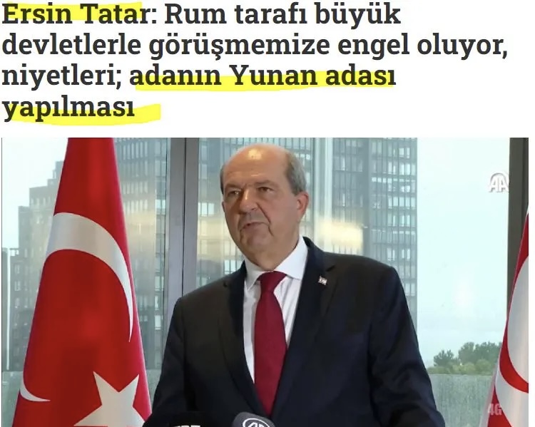 Δεν μπορούμε να μιλήσουμε στη Γενική Συνέλευση, δεν μπορούμε να μιλήσουμε με τις μεγάλες δυνάμεις, δεν μπορούμε να συναντηθούμε γιατί η ελληνική πλευρά το εμποδίζει. Δεν μας βλέπουν ούτε μας ακούνε, αλλά είμαι ευγνώμων που έχουμε Πρόεδρο της Δημοκρατίας της Τουρκίας, τον Ρετζέπ Ταγίπ Ερντογάν.