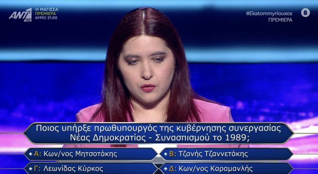 Η ερώτηση ήταν ποιος ήταν ο πρωθυπουργός στην συγκυβέρνηση ΝΔ-Συνασπισμός του 1989 και η παιχτρια επέλεξε να απαντήσει ο Κωνσταντινος Μητσοτακης και έχασε πανηγυρικά. Μάλιστα δεν είχε χρησιμοποιήσει καμία βοήθεια ενώ θα μπορούσε.