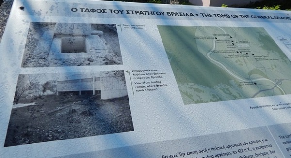 Σύμφωνα με τον ιστορικό Θουκυδίδη (Θουκ. IV.104, 106, 108 και V, 6, 10, 11), ο στρατηγός Βρασίδας ήταν ο ικανός στρατηγός της Σπάρτης που τάφηκε το 422 π.Χ. με τιμές εντός των τειχών και μπροστά στην αγορά της πόλης μετά τη φονική μάχη μεταξύ Κλέωνος και Βρασίδα (Στρατηγών Αθηναίων και Σπαρτιατών) που δόθηκε τη χρονιά αυτή μπροστά στα τείχη της πόλης.