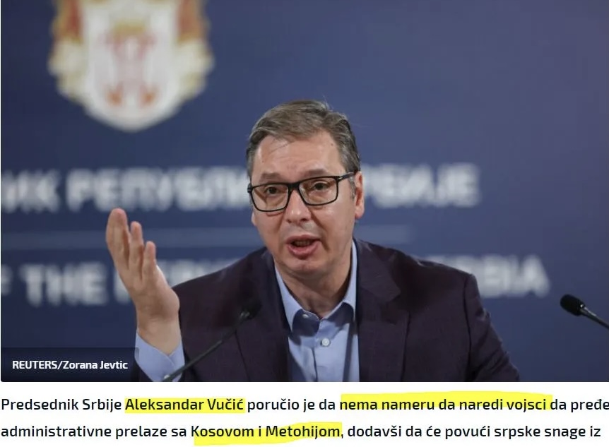Ο πρόεδρος της Σερβίας Αλεξάνταρ Βούτσιτς δήλωσε ότι δεν έχει πρόθεση να διατάξει τον στρατό να περάσει τις διοικητικές διαβάσεις με το Κοσσυφοπέδιο και τα Μετόχια, προσθέτοντας ότι θα αποσύρει τις σερβικές δυνάμεις από την περιοχή γιατί, όπως είπε, η κλιμάκωση της σύγκρουσης θα ήταν αντιπαραγωγική όταν υπάρχει η επιθυμία της Σερβίας να γίνει μέλος της Ευρωπαϊκής Ένωσης.