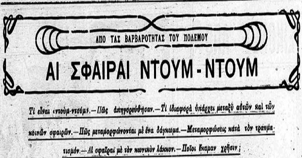«Μετά τον πόλεμον μεταξύ Ισπανίας και Αμερικής του 1898 και μετά τον πόλεμον του Τράνσβααλ του 1899, όταν συνήλθε το Συνέδριον της Ειρήνης εις την Χάγην, έθεσε μερικούς όρους δια να γίνωνται οι πόλεμοι με πλέον… πολιτισμένον τρόπον. Απηγορεύθη τότε δια κοινής συμφωνίας η καταστροφή πόλεων μη οχυρωμένων και άλλα τινά πράγματα, μεταξύ των οποίων και η χρήσις των σφαιρών των γνωστών με το όνομα: «ντούμ – ντούμ». Είνε δε «ντουμ – ντουμ» κάθε σφαίρα παντός όπλου, η οποία εις το εμπρόσθιον μέρος φέρει ανωμαλίας παντός είδους, δηλ: είνε χαραγμένη, ή ξυσμένη ή φέρει οπήν ή κοιλότητα. Κάθε σφαίρα η οποία δεν είνε λεία και αιχηρά εις το εμπρόσθιον μέρος της, ανοίγει τρομεράν πληγήν εις το σώμα του τραυματίου και σχίζει τους ιστούς γύρω, αφίνουσα μέγα χάσμα, δυσκόλως θεραπευόμενον. Έτσι αι σφαίραι «ντουμ – ντουμ» βασανίζουν τους τραυματίας. Τους φέρουν ταχύτερα προς τον θάνατον ή κάμνουν την θεραπείαν τους δύσκολον, μακροχρόνιον ή και ακατόρθωτον.»
