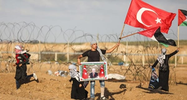 Ενδεικτικό είναι ότι η τουρκική Υπηρεσία Πολιτικής Προστασίας δημοσίευσε πρόσφατα άρθρο με τίτλο «Ποδήλατα από τον πρόεδρο Ερντογάν για τα παιδιά στη Γάζα». Η φωτογραφία που συνόδευε το άρθρο έδειχνε παιδιά με καινούργια ποδήλατα να στέκονται μπροστά σε μια αφίσα που έδειχνε τον Ερντογάν να στέκεται ανάμεσα στην τουρκική και την παλαιστινιακή σημαία υπό τον τίτλο: «Ο ηγέτης του ισλαμικού κόσμου – Ρετζέπ Ταγίπ Ερντογάν». Η αφίσα εστάλη και στην Παλαιστινιακή Αρχή, η οποία έδωσε εντολή για αφισσοκόληση σε όλα τα Παλαιστινιακά εδάφη…..