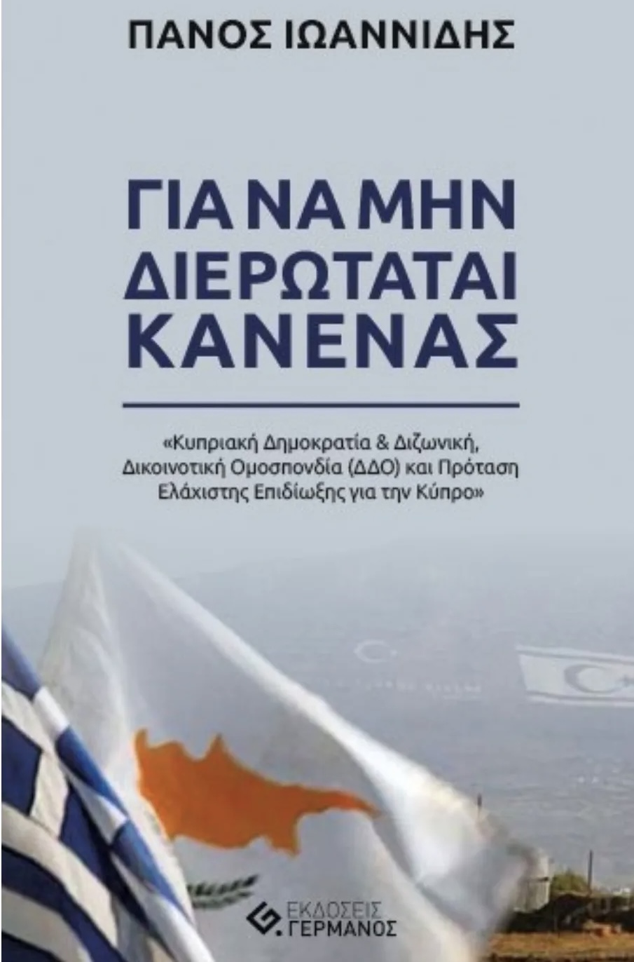 Κυκλοφόρησε πολύ πρόσφατα ένα μικρό μόλις 30 σελίδων βιβλίο του αγαπητού νομικού Πάνου Ιωαννίδη με τον τίτλο « ΓΙΑ ΝΑ ΜΗΝ ΔΙΕΡΩΤΑΤΑΙ ΚΑΝΕΝΑΣ» με τον υπότιτλο «Κυπριακή Δημοκρατία & Διζωνική, Δικοινοτική Ομοσπονδία (ΔΔΟ) και Πρόταση Ελάχιστης Επιδίωξης για την Κύπρο». Εκδόσεις ΓΕΡΜΑΝΟΣ (Θεσσαλονίκη) πρώτη έκδοση Σεπτέμβριος 2023.