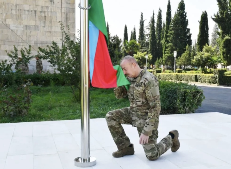Ο Αλίεφ υψώνοντας τη σημαία του Αζερμπαϊτζάν στην πόλη του Ναγκόρνο Καραμπάχ είπε χαρακτηριστικά: