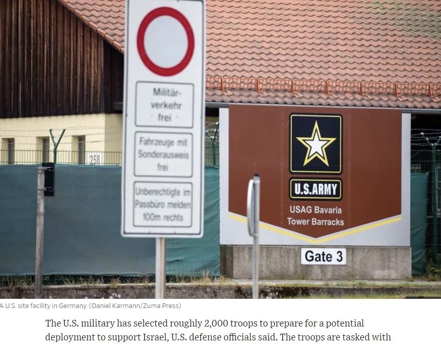 Ο αμερικανικός στρατός επέλεξε περίπου 2.000 στρατιώτες να προετοιμαστούν σε μια πιθανή ανάπτυξη για υποστήριξη του Ισραήλ, δήλωσαν αξιωματούχοι άμυνας των ΗΠΑ. Η στρατιωτική δύναμη είναι επιφορτισμένη με αποστολές όπως παροχή συμβουλών και ιατρικής υποστήριξης, είπαν οι αξιωματούχοι, και προέρχονται από όλες τις ένοπλες υπηρεσίες των ΗΠΑ.