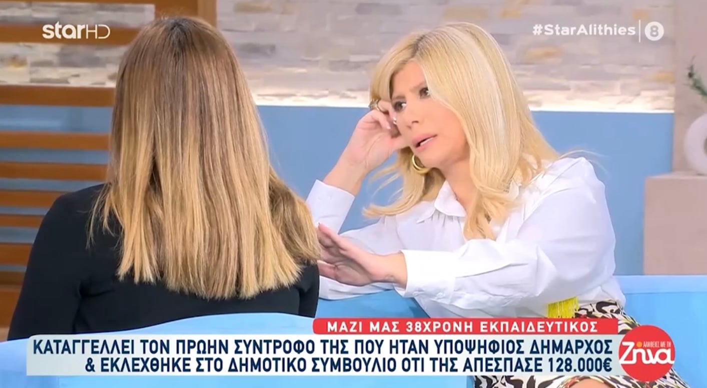 Η εκπαιδευτικός μίλησε στην εκπομπή «Αλήθειες με τη Ζήνα» και κατήγγειλε ότι ο υποψήφιος δήμαρχος κατάφερε να της αποσπάσει 128.000 ευρώ, αφού πρώτα την έπεισε ότι θα επενδύσει τα χρήματα αυτά σε προγράμματα του υπουργείου Ανάπτυξης.
