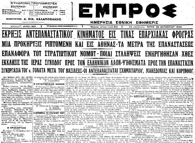 Τον Οκτώβριο του 1923 η Ελλάδα βάδιζε ολοταχώς για τις εκλογές της 2ας Δεκεμβρίου, τις οποίες είχε προκηρύξει η βενιζελική Επαναστατική Επιτροπή υπό τον Νικόλαο Πλαστήρα, που κυβερνούσε δικτατορικά, μετά τη Μικρασιατική Καταστροφή.