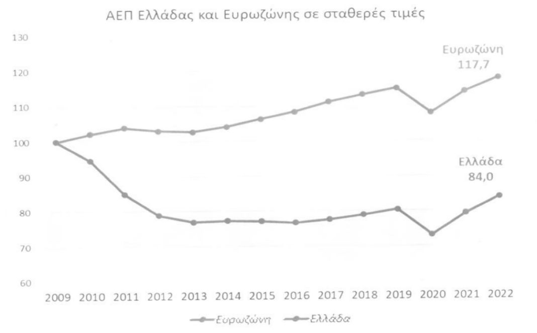 Ενώ το ΑΕΠ της Ελλάδας σε σταθερές τιμές έχει μειωθεί από το 100 το 2009 στο 84 το 2022, το μέσο ΑΕΠ της Ευρωζώνης έχει αυξηθεί από το 100 στο 117,7 στο ίδιο χρονικό διάστημα – γεγονός που σημαίνει πως η απόσταση της Ελλάδας έχει διευρυνθεί κατά 33,7 μονάδες, από την ίδια αφετηρία!
