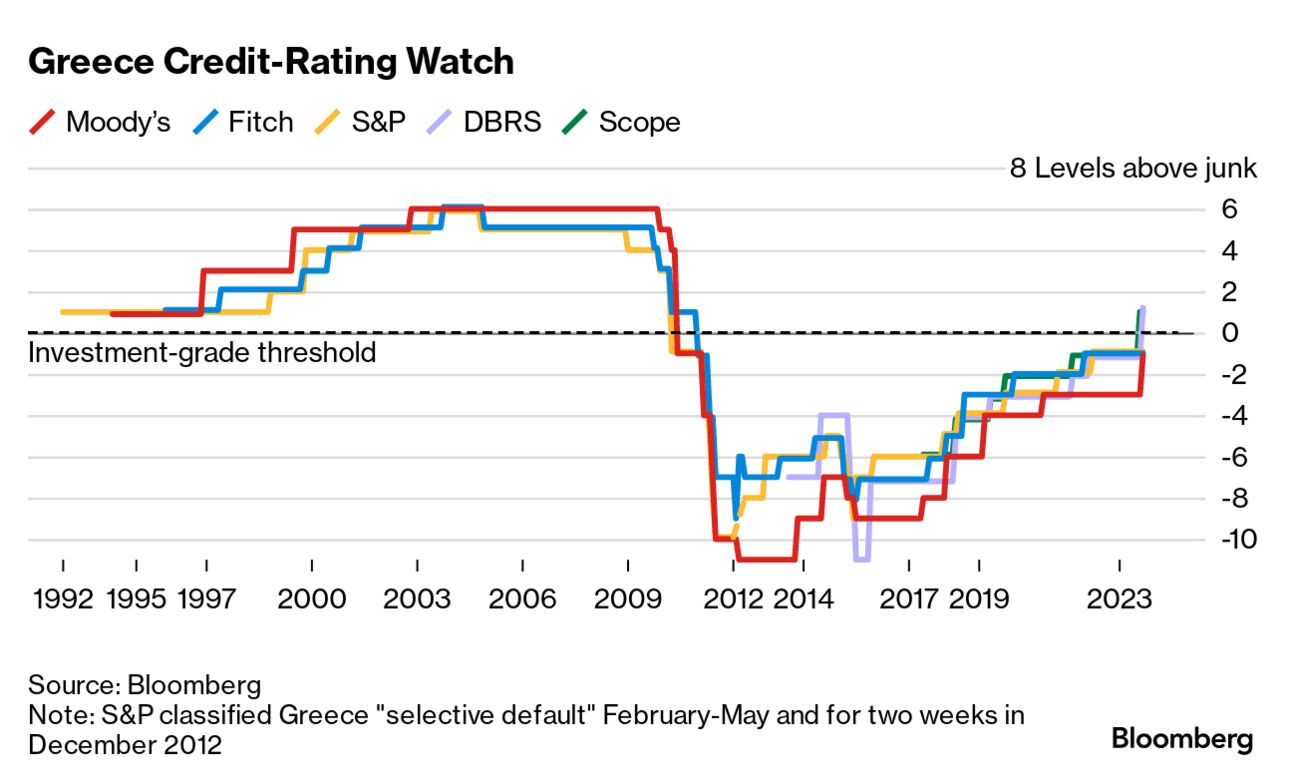 Όπως βλέπετε από το διάγραμμα του Bloomberg οι αξιολογήσεις όλων των οίκων αξιολόγησης ήταν κατά πολύ καλύτερες (3πλάσιες) από τη σημερινή