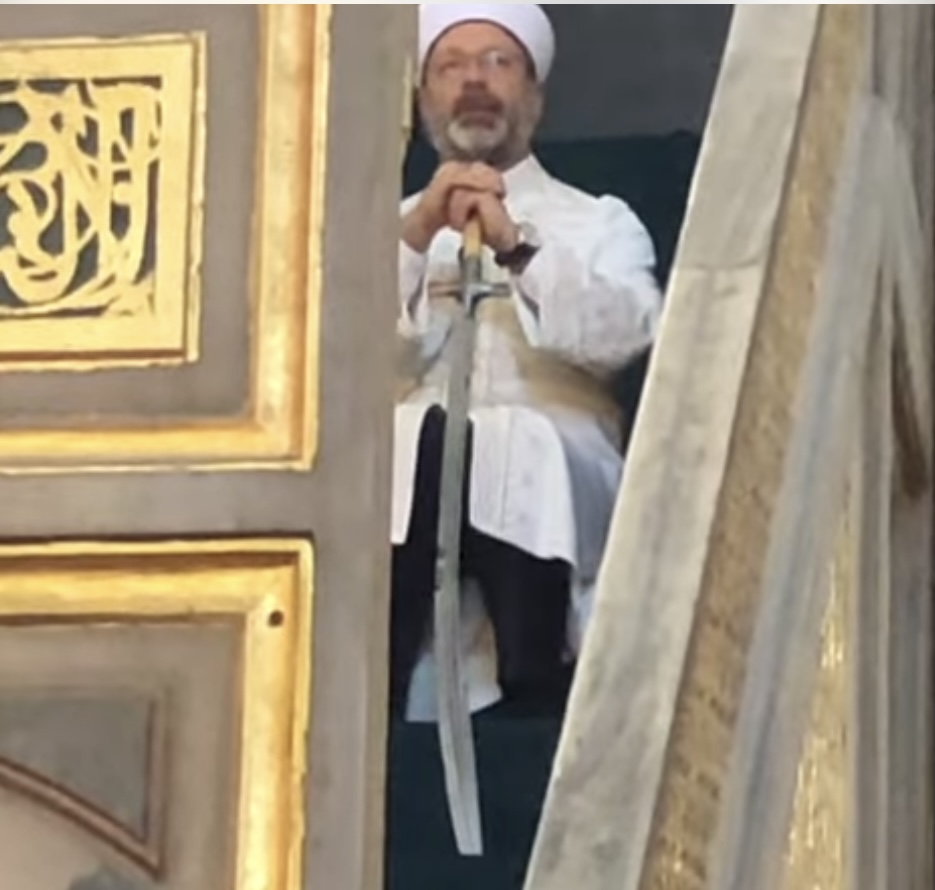 Συγκεκριμένα, ο διευθυντής Θρησκευτικών Υποθέσεων της Τουρκίας στον άμβωνα της Αγίας Σοφίας την ώρα που πραγματοποιούσε ομιλία για τη Γάζα κρατούσε ένα σπαθί, γεγονός για το οποίο τα τουρκικά μέσα σχολίασαν ότι πρόκειται για «σύμβολο εκφοβισμού του εχθρού, εμπιστοσύνης σε φίλους».