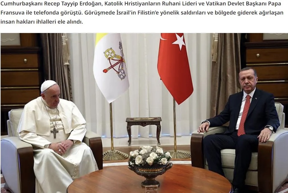 Ο Πρόεδρος Ρετζέπ Ταγίπ Ερντογάν μίλησε τηλεφωνικά με τον Πάπα Φραγκίσκο, τον Πνευματικό Ηγέτη των Καθολικών Χριστιανών και Πρόεδρο του Βατικανού.
