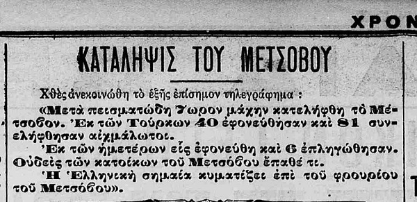 Μικτό στρατιωτικό απόσπασμα, υπό τον Αντισυνταγματάρχη Μήτσα, μετά από σκληρό αγώνα, απελευθερώνει το Μέτσοβο. Στον αγώνα συμμετέχει και τμήμα από 53 εθελοντές Κρήτες, υπό τον Γ. Σκουλά.