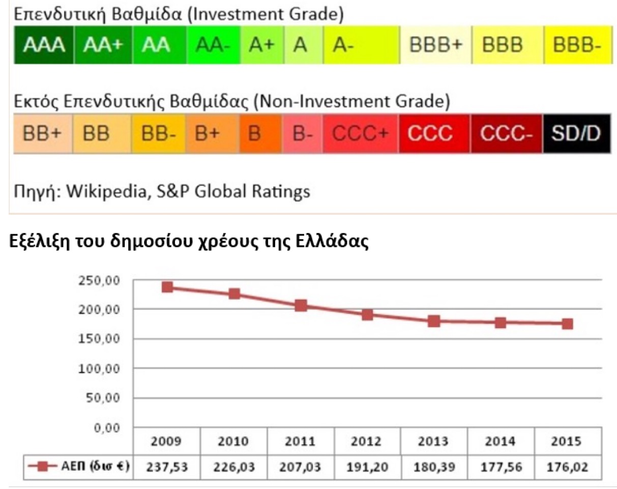 Έως τις 7.12.2009, η Ελλάδα αξιολογούταν από την S&P με Α- από το ΒΒΒ- που μας αναβάθμισε πρόσφατα – στην τελευταία θέση δηλαδή της επενδυτικής βαθμίδας σήμερα. Η έξοδος μας δε από την επενδυτική βαθμίδα, επήλθε στις 27.4.2010 – όπου μέσα σε μία ημέρα βρεθήκαμε από το ΒΒΒ+ στο ΒΒ+ ή τρεις βαθμίδες χαμηλότερα. Τελικά, στις 27.2.2012, με το PSI, βυθιστήκαμε στο SD – στην επιλεκτική χρεοκοπία και στην τελευταία θέση.