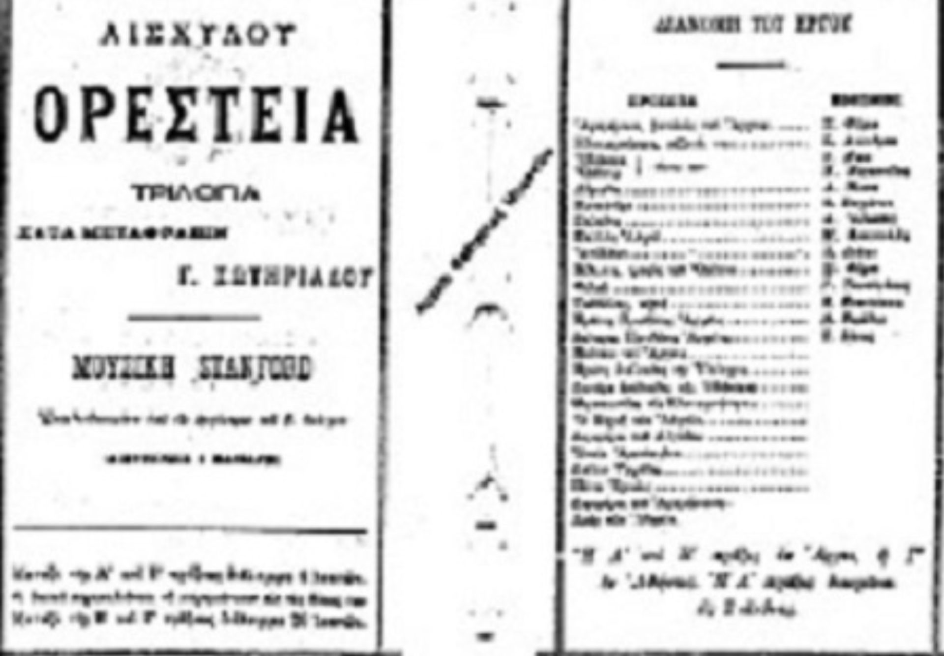 Ύστερα από 2.461 χρόνια, όπως υπενθύμιζε εφημερίδα της εποχής, η «Ορέστεια» ανέβηκε από το Βασιλικόν (Εθνικό σήμερα) Θέατρο, υπό τη φωτισμένη καθοδήγηση του Στέφανου Στεφάνου, διευθύνοντα γραμματέα του θεάτρου και πρωτοπόρου ποιητή, μεταφρασμένη σε απλή νεοελληνική γλώσσα (συντηρητική δημοτική) από τον καθηγητή του Πανεπιστημίου Γεώργιο Σωτηριάδη -«ευρυμαθούς ελληνιστού και διαπρεπούς αρχαιολόγου».
