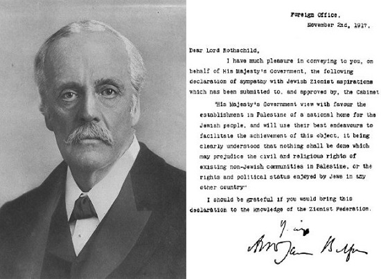2 Νοεμβρίου 1917: Ενώ η εξέγερση κατά των Οθωμανών εξελίσσεται νικηφόρα για τους Άραβες που ονειρεύονται ανεξαρτησία, ο Βρετανός υπουργός Εξωτερικών, Άρθουρ Τζέιμς Μπάλφουρ, αποστέλλει μία επιστολή στον ηγέτη της εβραϊκής κοινότητας της Μεγάλης Βρετανίας, Λόρδο Ρότσιλντ, ζητώντας να τη διαβιβάσει στη Διεθνή Σιωνιστική Ομοσπονδία.