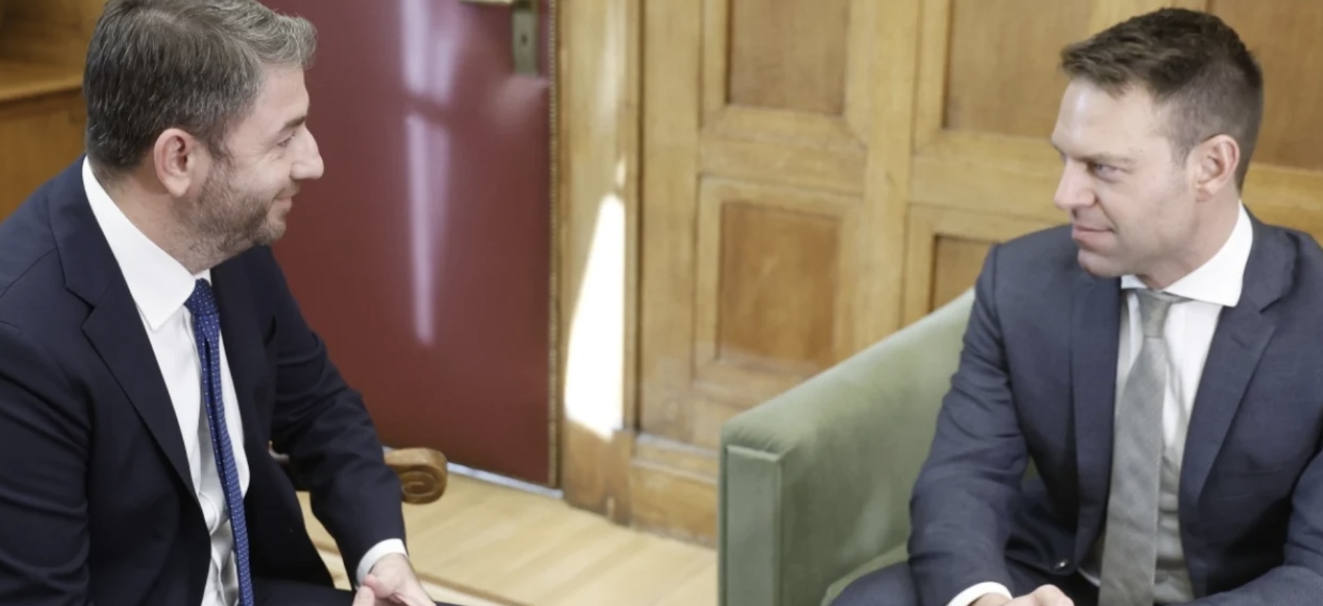 Οι δύο πολιτικοί αρχηγοί συναντήθηκαν με φόντο το σκάνδαλο των υποκλοπών, το οποίο επιχειρεί να συγκαλύψει η κυβέρνηση, με τον καναπέ του Ανδρουλάκη να γίνεται αφορμή για να ανοίξει και να κλείσει η συζήτησή τους.