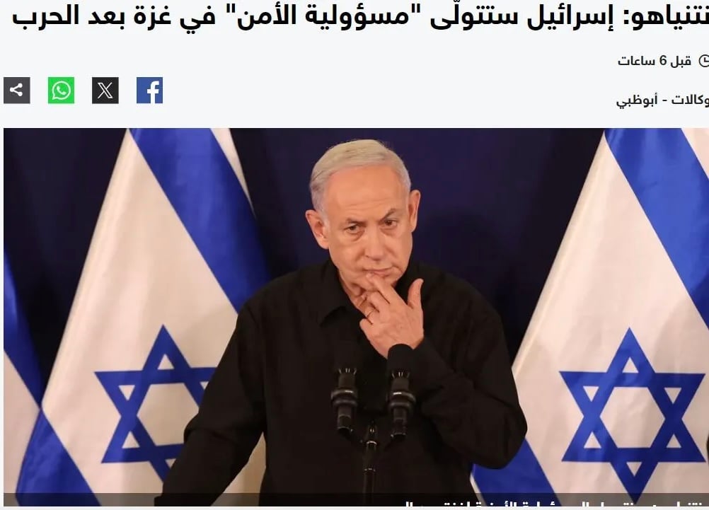 Ο Ισραηλινός πρωθυπουργός Μπενιαμίν Νετανιάχου ανακοίνωσε ότι το Ισραήλ θα αναλάβει «ολοκληρωτική ευθύνη ασφάλειας» στη Λωρίδα της Γάζας για αόριστο χρονικό διάστημα μετά τον πόλεμο που διεξάγει αυτή τη στιγμή εναντίον της Χαμάς, επαναλαμβάνοντας την απόρριψή του για κατάπαυση του πυρός προτού το κίνημα απελευθερώσει τους ομήρους, όπως σημειώνει αραβικό δημοσίευμα.