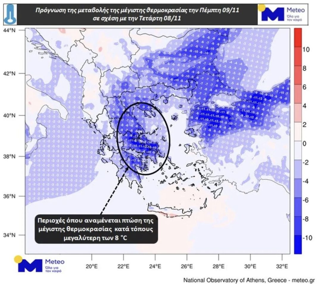 Στον χάρτη που ακολουθεί παρουσιάζεται η αναμενόμενη πτώση της μέγιστης θερμοκρασίας την Πέμπτη σε σχέση με αυτή της Τετάρτης (08/11).