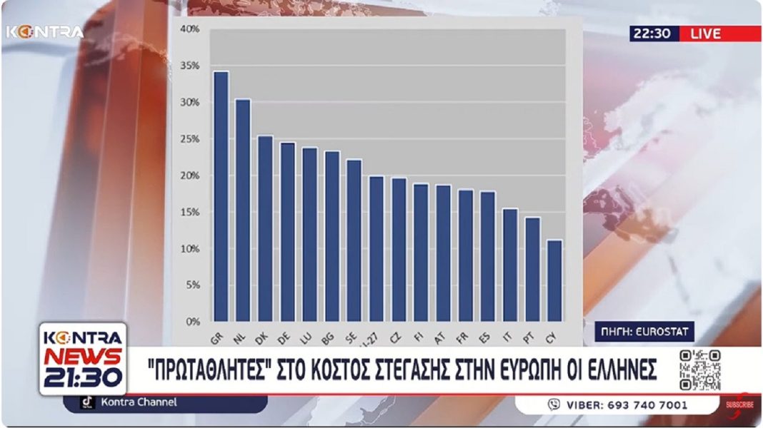 Συγκεκριμένα, το κόστος στέγασης ως ποσοστό του διαθέσιμου εισοδήματος των νοικοκυριών στην Ελλάδα διαμορφώθηκε σε 34,2% για το 2022, έναντι 19,9% κατά μέσο όρο για την Ευρώπη των 27.