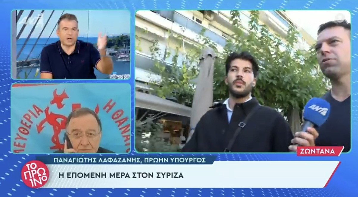Μετά την εκκοπμπη της Κατερίνας Καινουργιου ο Λαφαζανης βγήκε και στην εκπομπή του Γιώργου Λιάγκα με φόντο μάλιστα μια σημαία που ελεγε Ελευθερία ή Θανατος, θάβοντας οσο μπορούσε περισσότερο τον Στέφανο Κασσελακη.